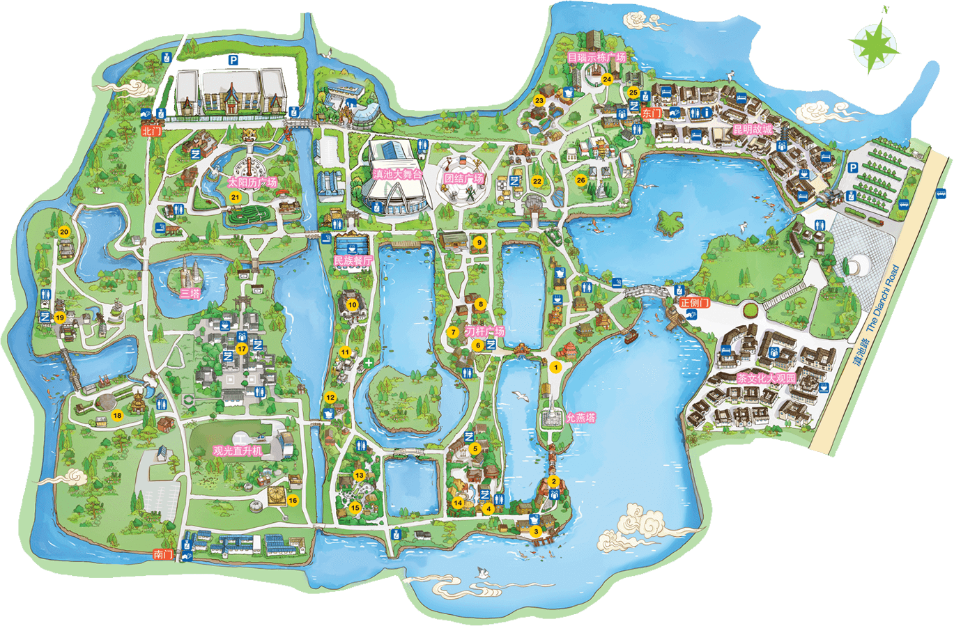 納西族人口約28萬(wàn),主要聚居在麗江市玉龍納西族自治縣。納西族村占地49.5畝。入口處有納西族保護(hù)神“三朵”塑像和以《創(chuàng)世紀(jì)》為題材的大型浮雕墻。重彩繪畫(huà)和精細(xì)木作為特色的“三坊一照壁”、“民居院”、“花馬坊”、“工藝樓”、“廊房”等重要建筑圍合烘托出“四方街”。納西族歷史悠久,文化豐富,著名的東巴象形文字被譽(yù)為象形文字的“活化石”。它是目前世界上仍在民間流傳使用的象形文字。用東巴文寫(xiě)成的典籍,叫“...