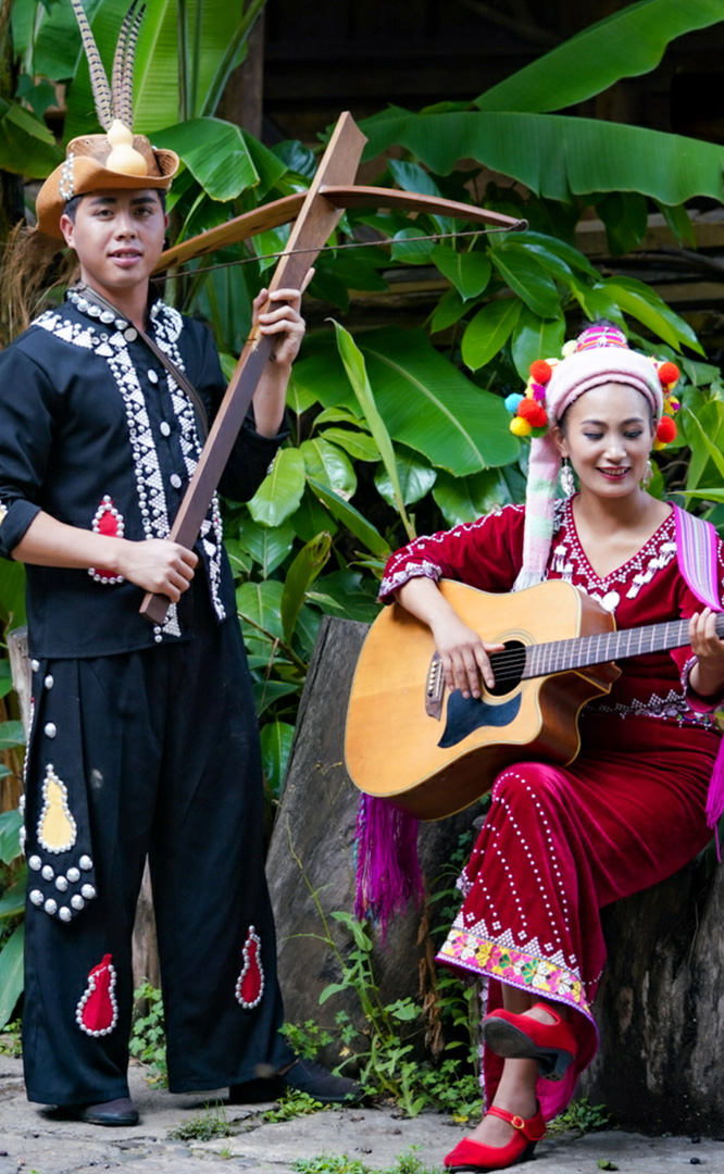 德昂族人口約1.7萬(wàn),主要分布在德宏州和保山市的潞西、梁河、瑞麗、隴川、隆陽(yáng)等縣區(qū)。民居多為草排覆頂竹木結(jié)構(gòu)的干欄式建筑,眼前的德昂村建筑納入了能容納數(shù)十人居住的德昂大房子,氈帽頂?shù)男》孔樱€有頗具浪漫色彩的大公房、小公房……還建有“龍陽(yáng)塔”標(biāo)志及佛教奘房、佛塔。德昂族民間普遍信奉南傳佛教,民俗活動(dòng)與佛事活動(dòng)關(guān)聯(lián)緊密。潑水節(jié)、開(kāi)門(mén)節(jié)、關(guān)門(mén)節(jié)是重大節(jié)日。德昂族服飾色彩豐富,口頭文學(xué)特別是民歌創(chuàng)作活動(dòng)...