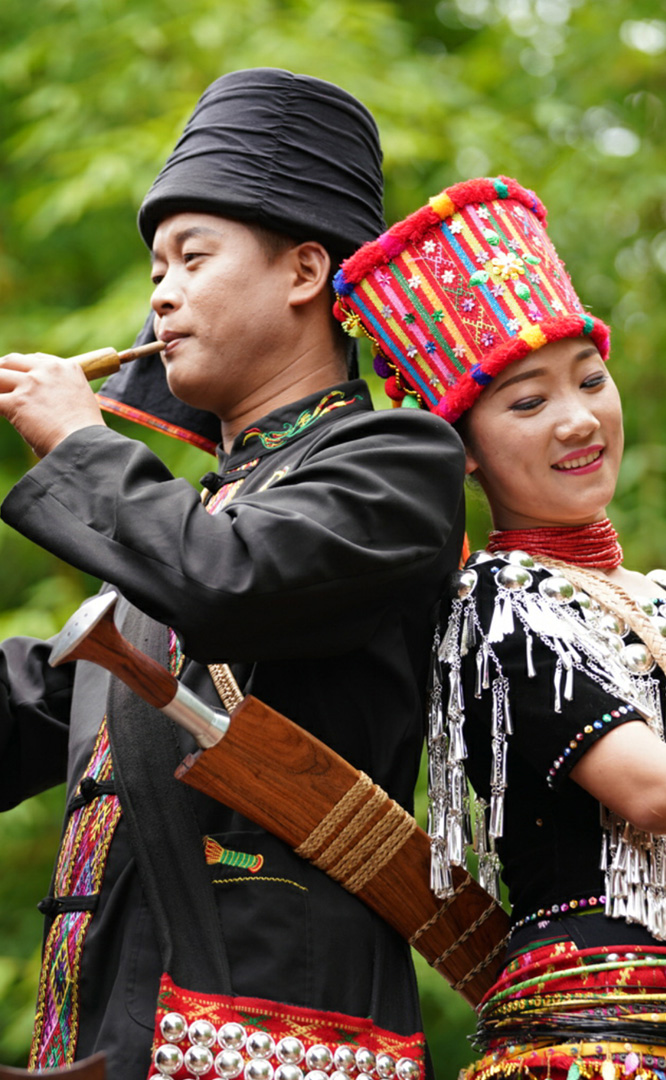 拉祜族人口約41萬(wàn),主要聚居在思茅、臨滄境內(nèi)的瀾滄江沿岸地區(qū)。拉祜族寨與基諾族寨緊緊毗連,寨內(nèi)建有拉祜族茅草房、大公房、教堂、牛棚以及葫蘆廣場(chǎng)。位于拉祜族寨中心位置的葫蘆廣場(chǎng)形似一只碩大的葫蘆平面,核心有一組石雕葫蘆。傳說(shuō)拉祜族的祖先誕生于葫蘆中,因此葫蘆廣場(chǎng)表現(xiàn)了拉祜族的祖先崇拜觀(guān)念。漫步拉祜族寨,葫蘆笙悠揚(yáng)婉轉(zhuǎn)、口弦聲余音繞梁,表現(xiàn)拉祜族勞動(dòng)場(chǎng)面的“豐收擺舞”充滿(mǎn)歡騰和激情,展示了拉祜族的民間...
